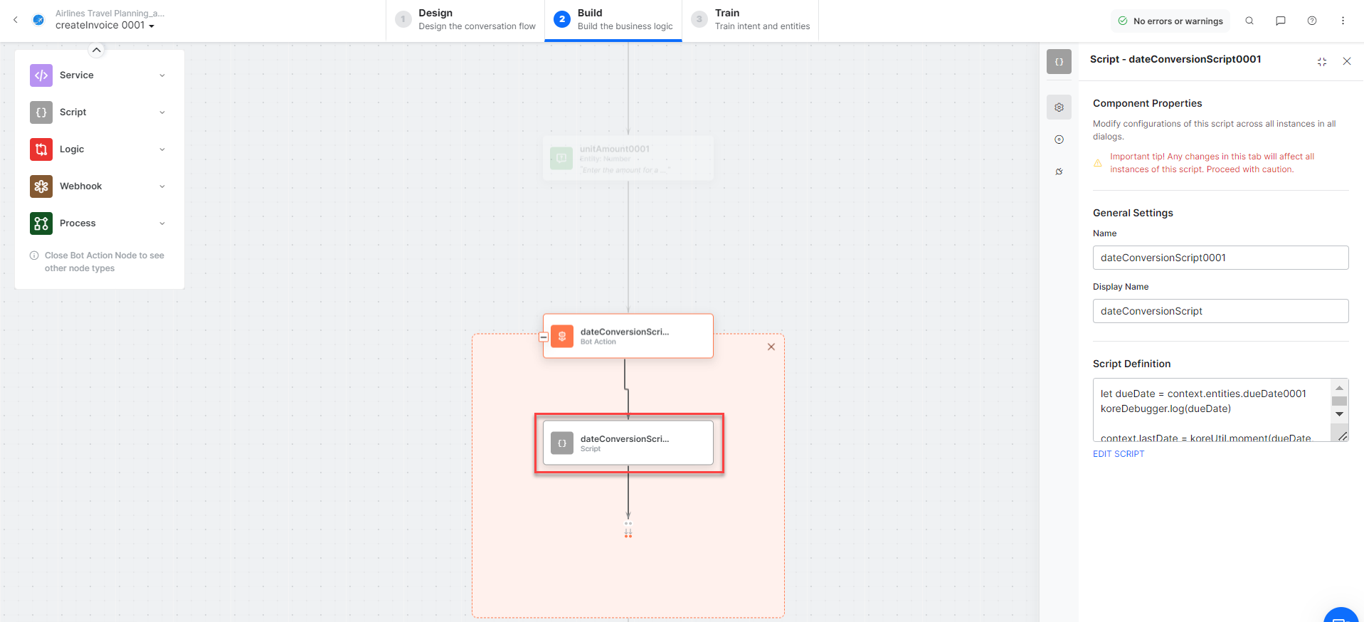 createInvoiceScript – A bot action service to create an invoice in an external integration. Click the Plus icon to expand to view the createInvoiceScript bot action component properties.