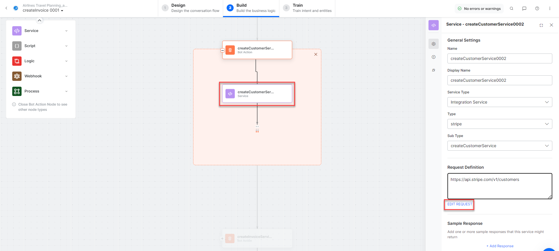 - createInvoiceMessage – A message node with the script to display responses for various scenarios.