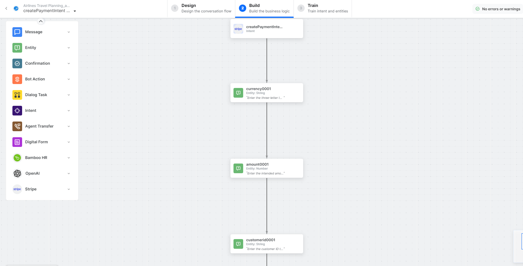 - currency, amount, and customer – Entity nodes for gathering the required payment details.
