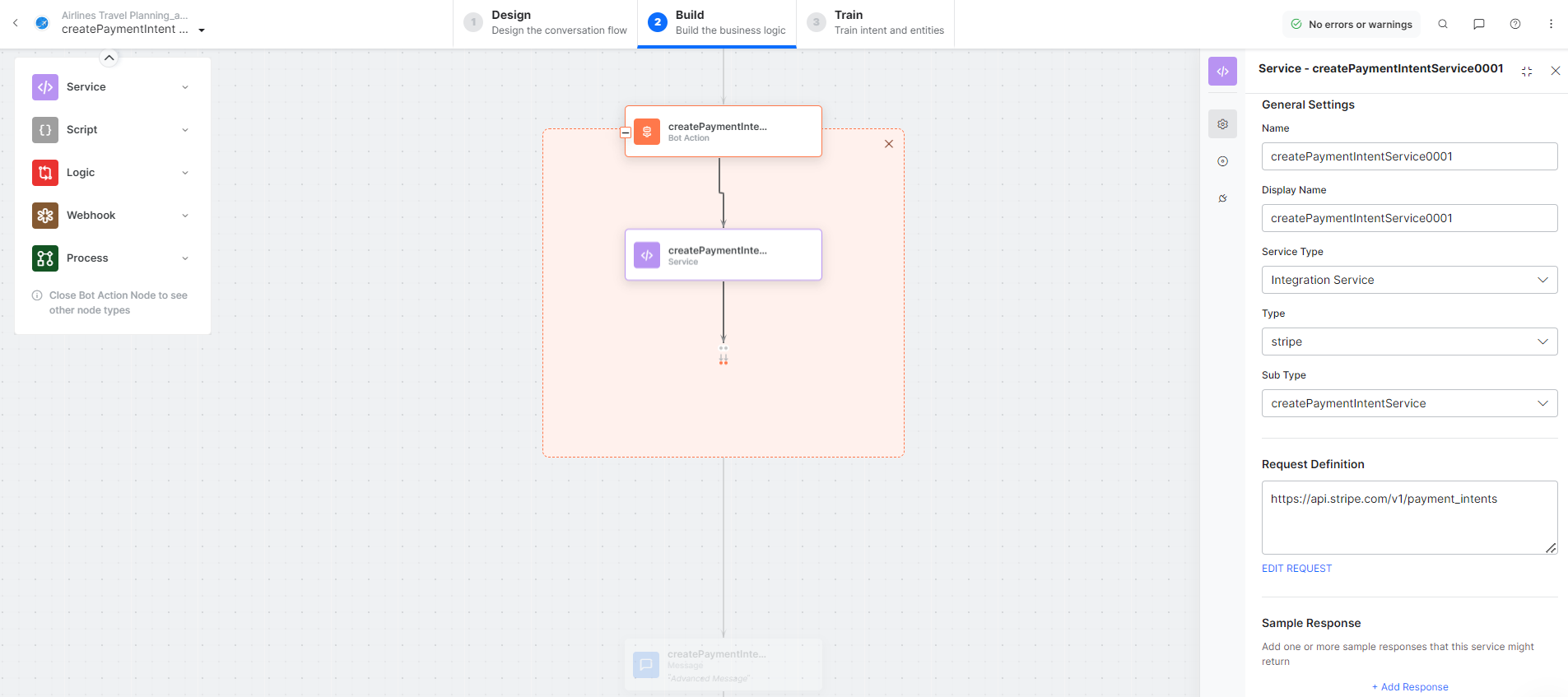 createPaymentIntentMessage – A message node with the script to display responses for various scenarios.