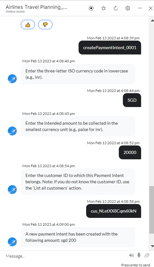 - Follow the prompts in the App console to create payment intents as shown below: