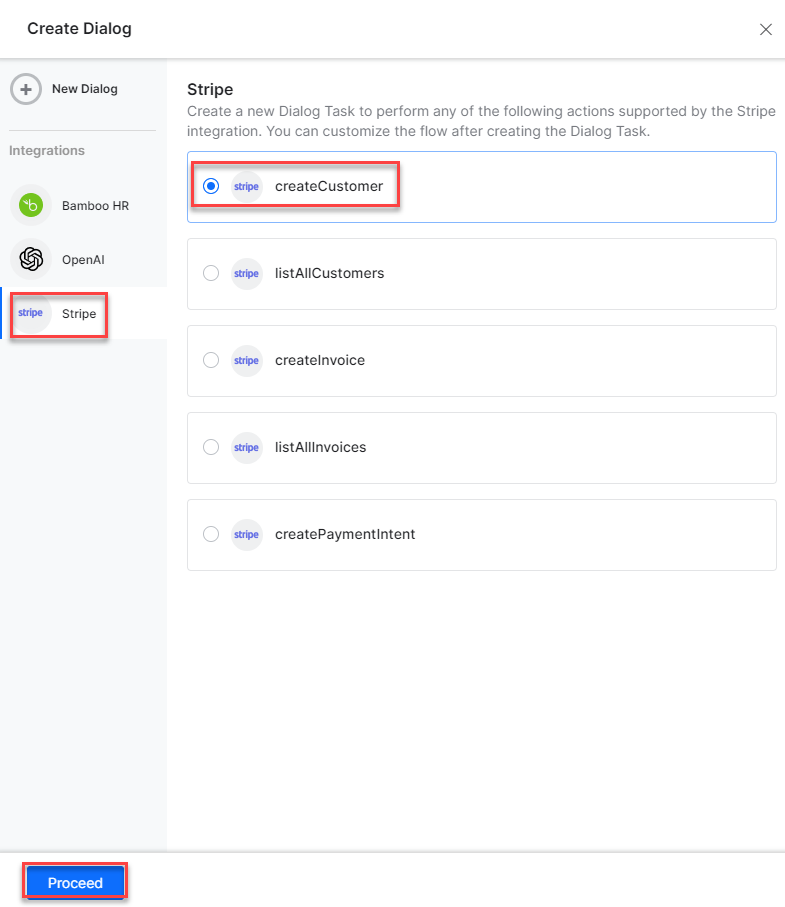 On the Dialog Task pop-up, under the Integration, select the Stripe option to view the action templates.