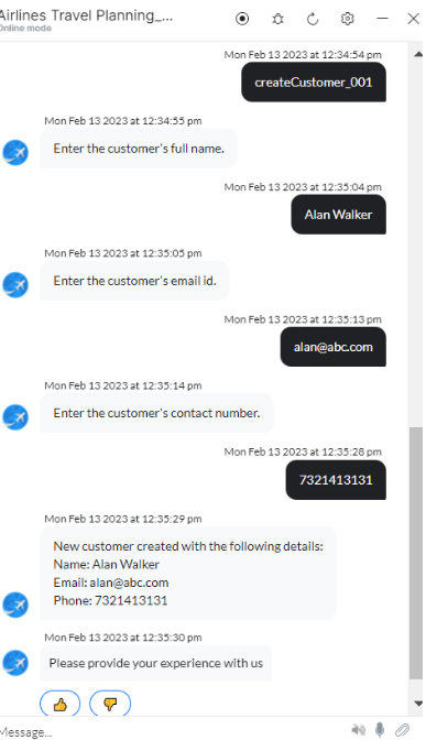 - Follow the prompts in the App console to create a customer as shown below: