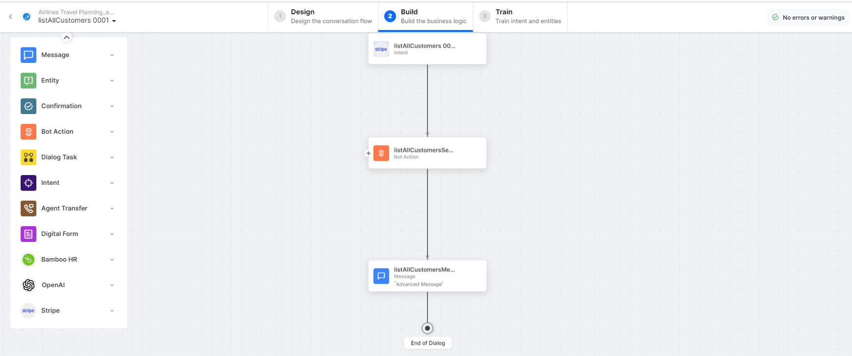 listAllCustomersMessage – A message node with the script to display responses for various scenarios.