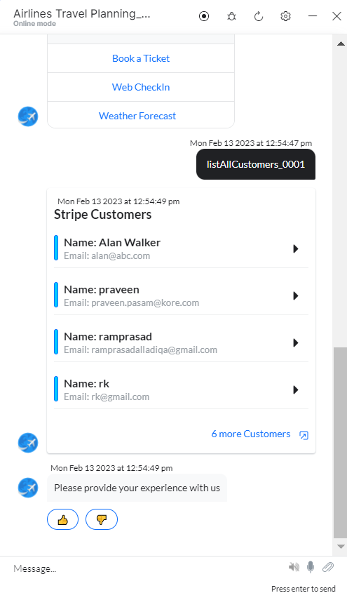 - Follow the prompts in the App console to view all customers as shown below: