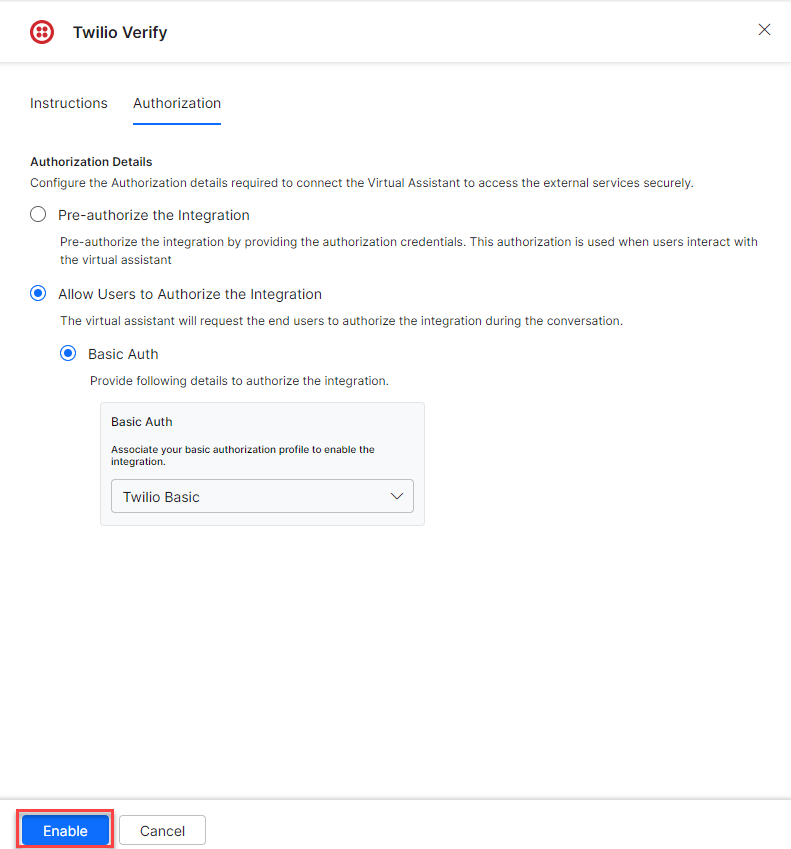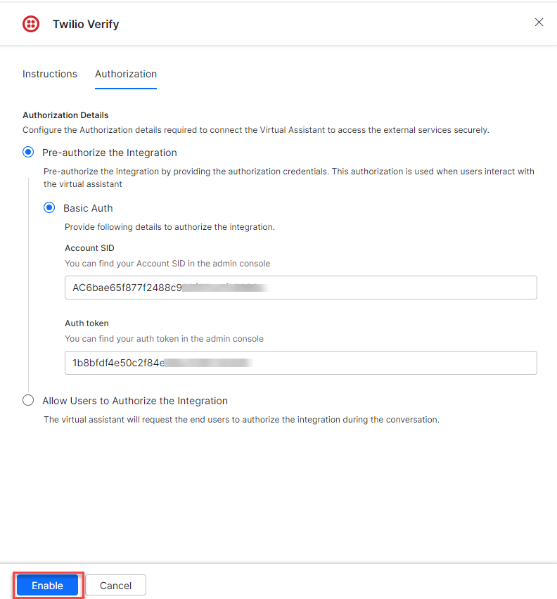 You can authorize the integration at a user level with their login credentials. The user authorization process involves requesting permission for Kore.ai’s Twilio Verify app to access an access token at runtime. You can also use the basic auth profile to let a user configure the integration at runtime.