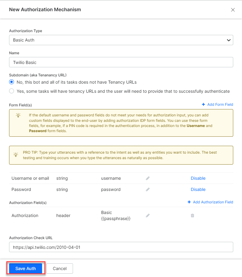 - Authorization Check URL – Enter the authorization check URL for your Twilio Verify instance.