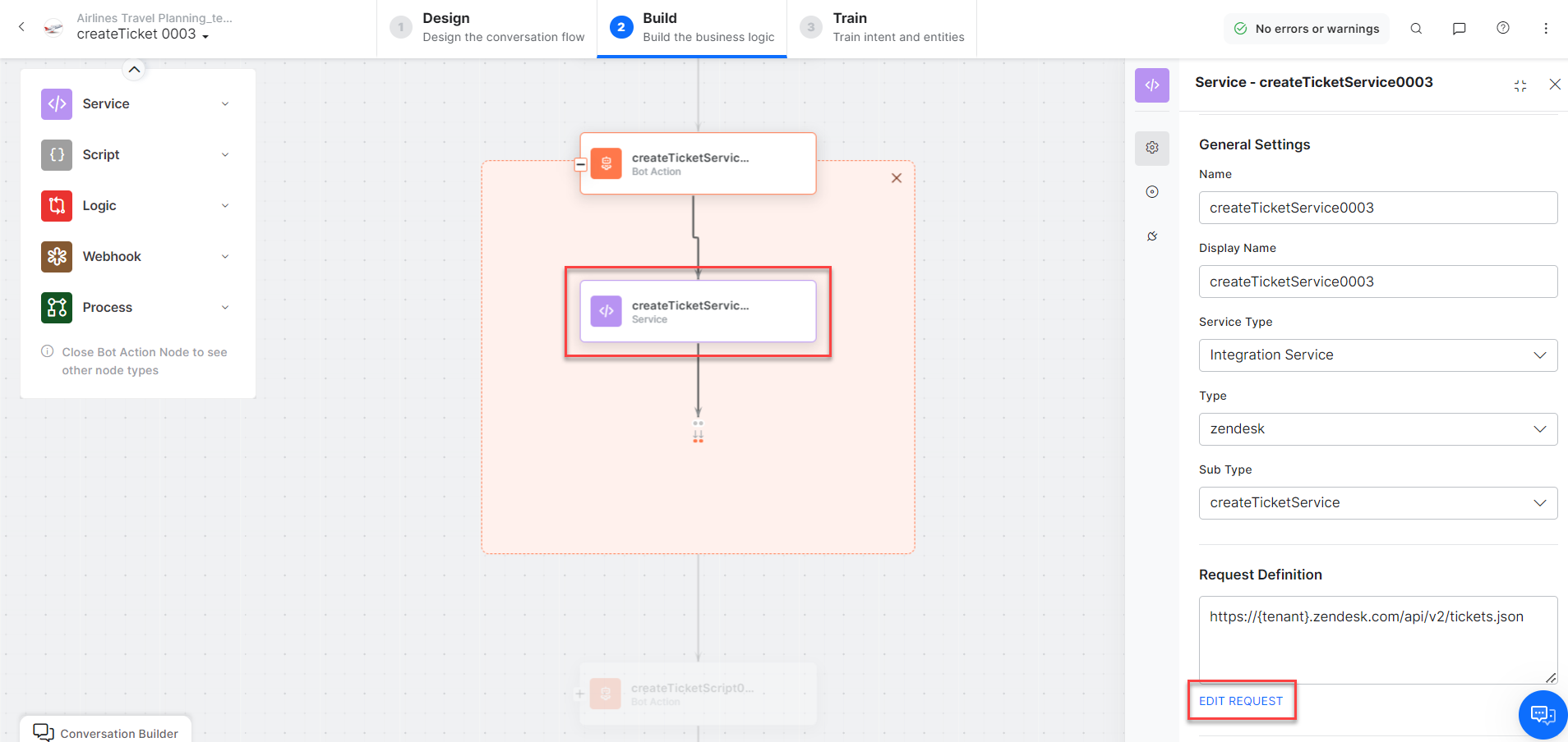 - createTicketService – A bot action service to create a ticket in an external integration. Click the Plus icon to expand to view the createTicketService bot action component properties.
