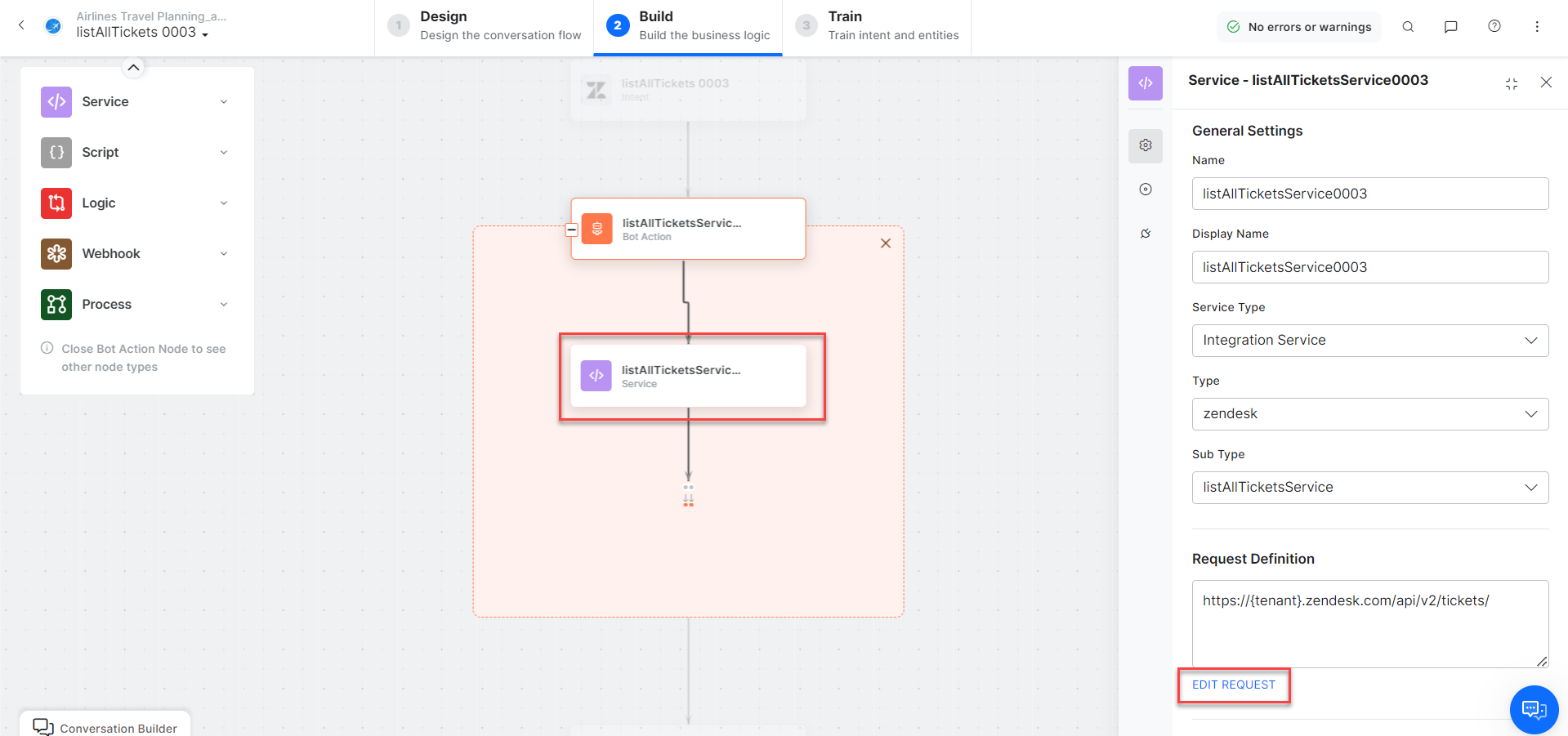 - listAllTicketsService – A bot action service to fetch all tickets from an external integration. Click the Plus icon to expand to view the listAllTicketsService bot action component properties.