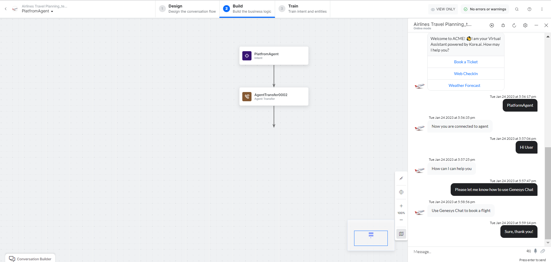 To verify the data exchange between Kore.ai’s AI Agent and Genesys agent, follow these steps: