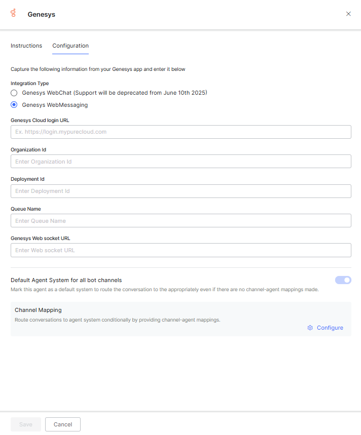 - Click Save to enable the Genesys agent.