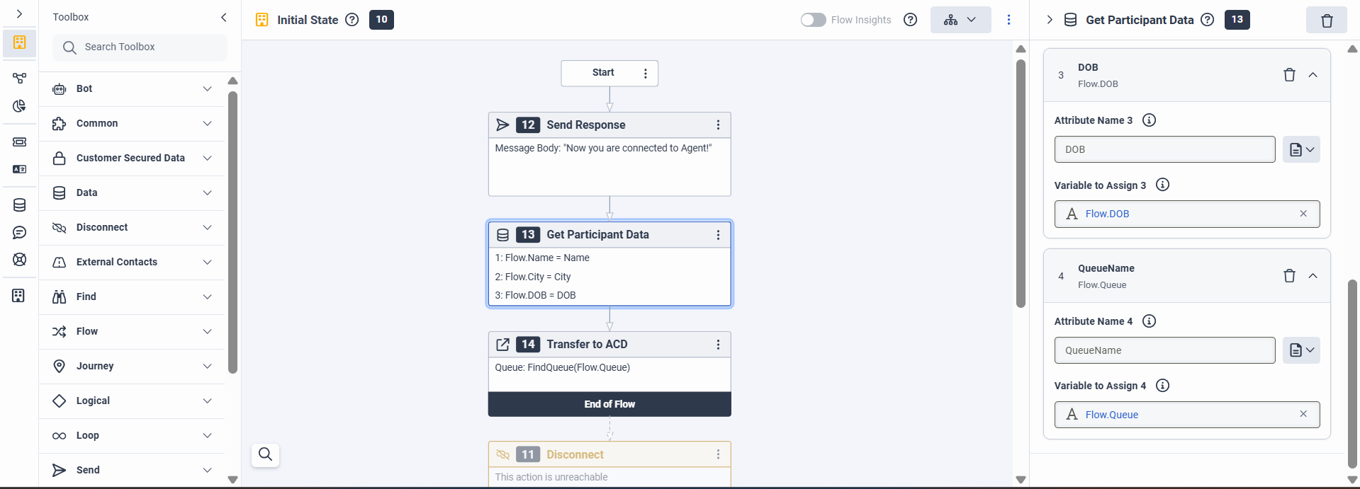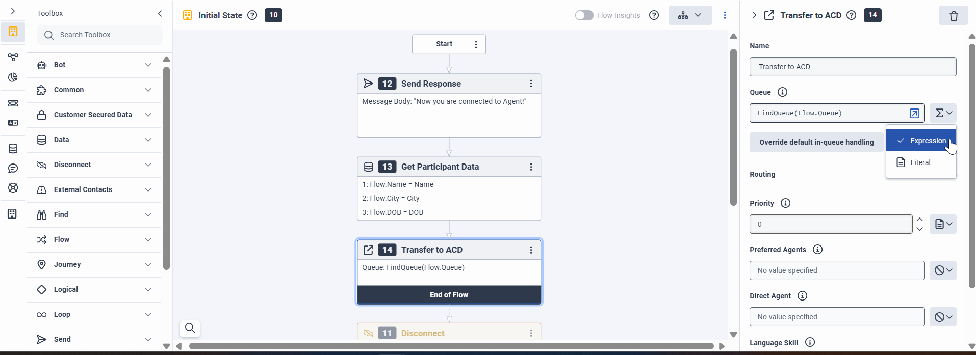 - Then, reference these flow variables as needed in the Transfer to the ACD node to ensure the metadata is properly utilized during the agent transfer.