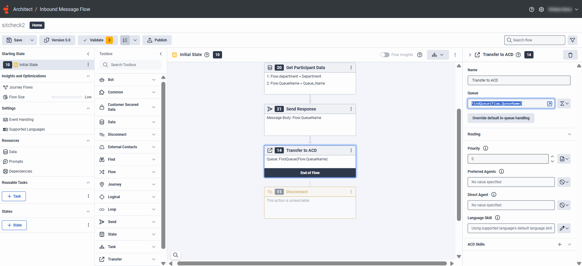 - Add the GetParticipantData action before the Transfer to the ACD node in the Architect Message Inbound Flow.