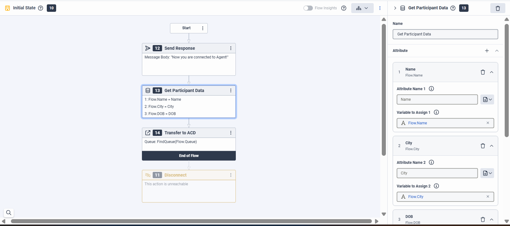 - In the GetParticipant Data action, create flow variables and then map the relevant metadata attributes to these flow variables.