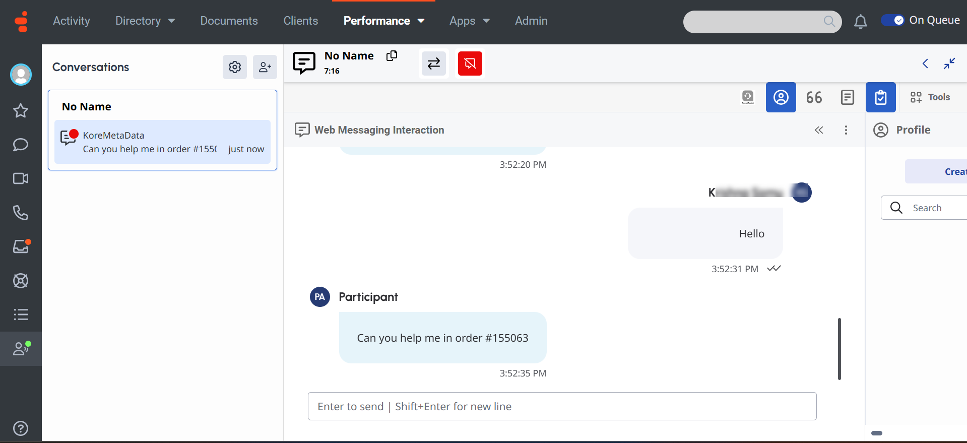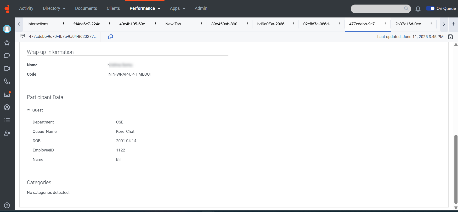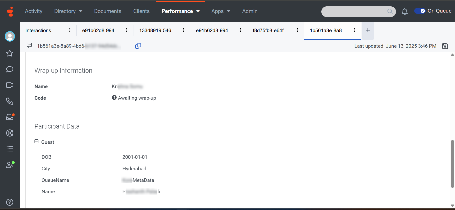 Once the Agent Transfer process begins, the metadata you’ve passed will be stored in the Participant Data section. To view this metadata in the Genesys Agent Desktop, go to Admin > Performance > Workspace > Interactions > [Select the Interaction] > Participant Data.