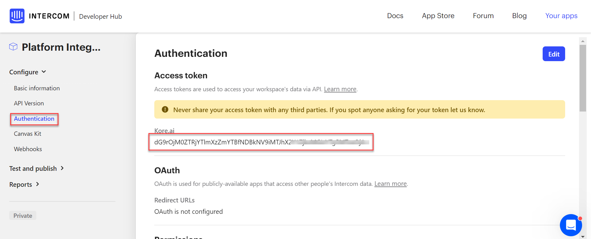 - Access Token: The access token ID for the Intercom, which was copied step 2.