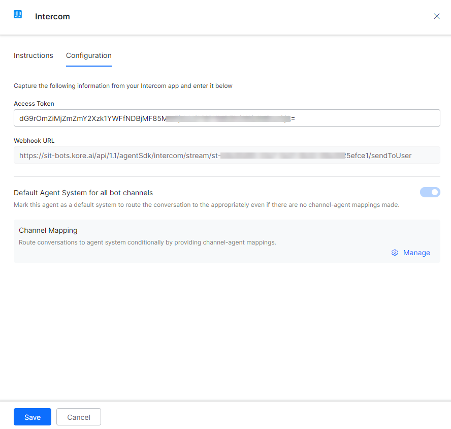 Once you click Manage, you can map the channels which you want to use Intercom agent to handover the conversations. To learn more about channel enablement, read the Adding channels to your app article.