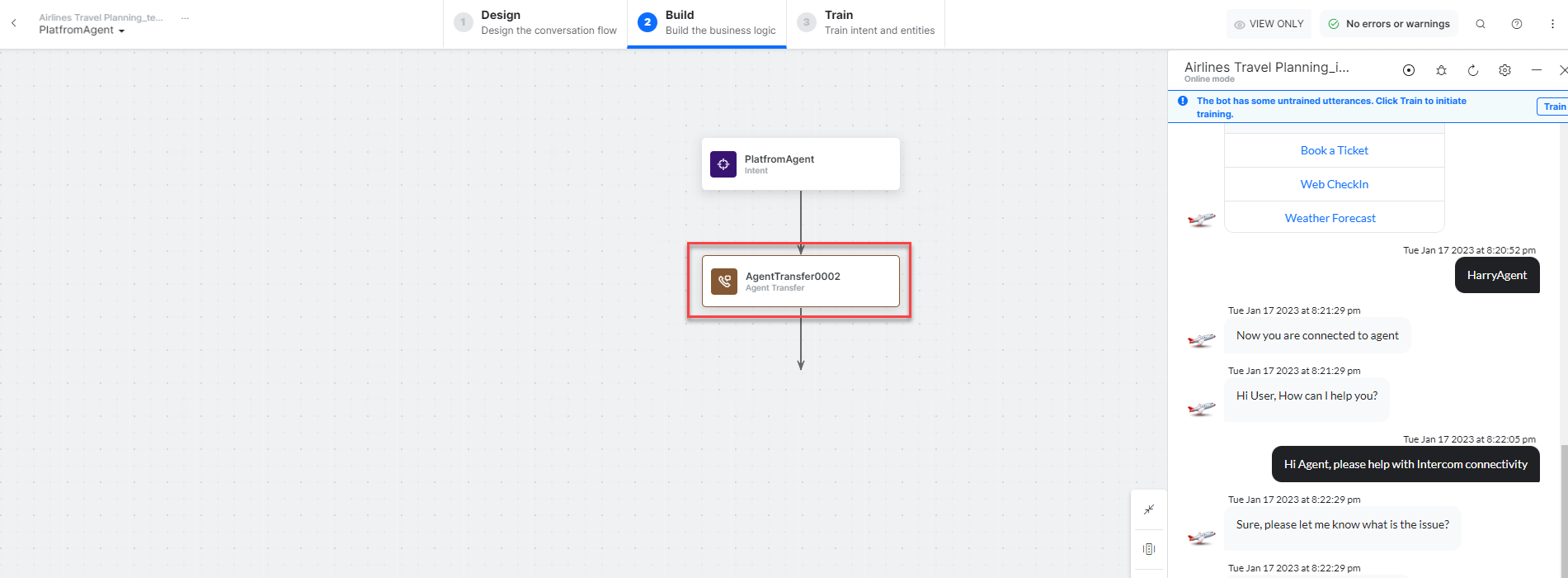 Create a new Agent Transfer Node task. For example, create a PlatformAgent task with the UserChats node and configure it to use the Intercom agent. For more information, read the Agent Transfer Node article.