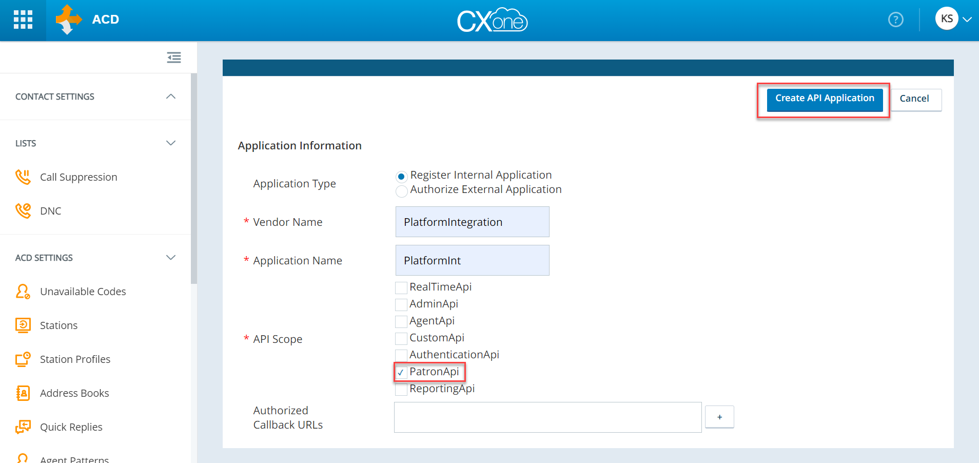 - In the NiceInContact Central website, under the ACD > ACD Configuration > API Applications menu and click Create New.