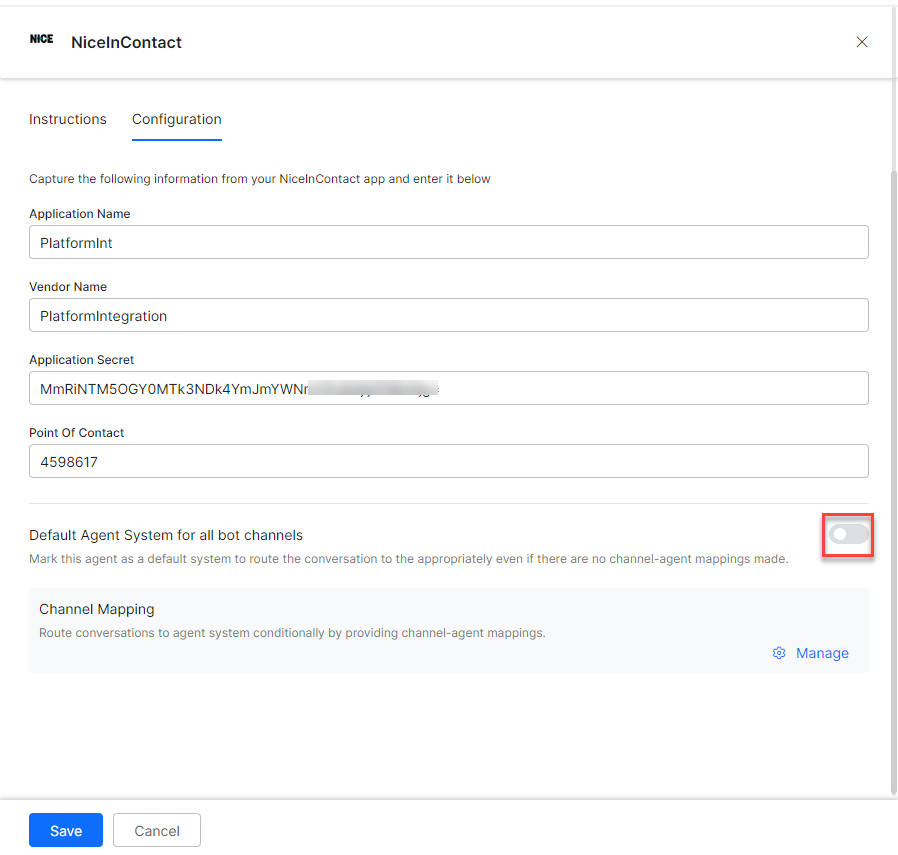 If you want to make NiceInContact the default agent, enable the Default Agent System for all app channels option.
