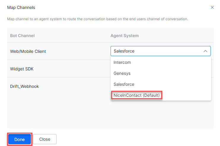 Click Manage to map the channels you want to use to the NiceInContact agent for handing over the conversations. To learn more about channel enablement, see Adding channels to your app.