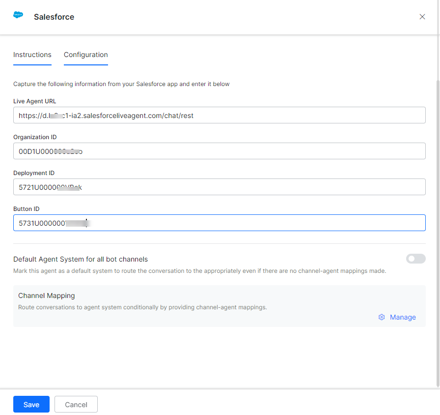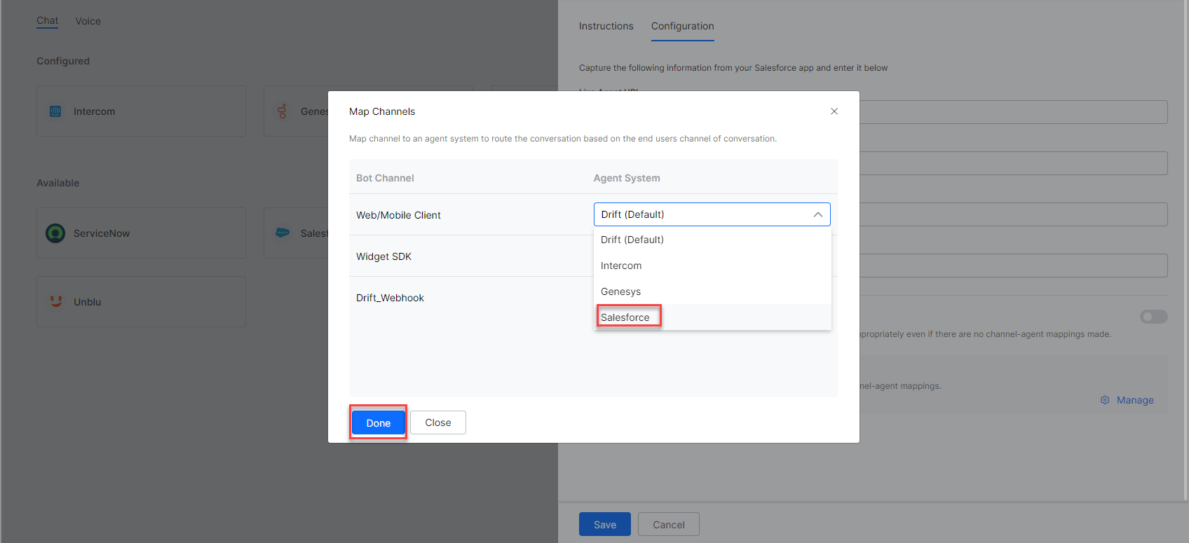 Click Manage to map the channels you want to use Salesforce agent for handing over the conversations. To learn more about channel enablement, see Adding channels to your bot.