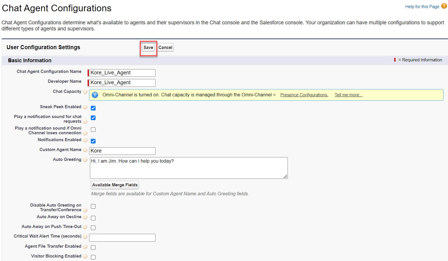Once you have entered the required details, click the Save button to save the new Live Agent configuration.