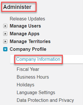 From the main menu on the top, navigate to Administer > Company Settings > Company Information.