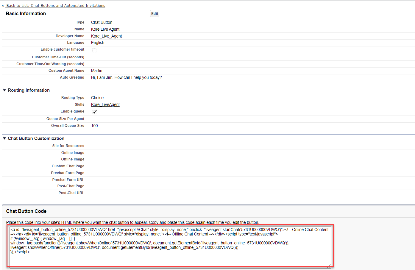 - Go to Customize > Chats Chat Sessions > Chat Buttons & Invitations page, and click the button that you want to use for this integration.