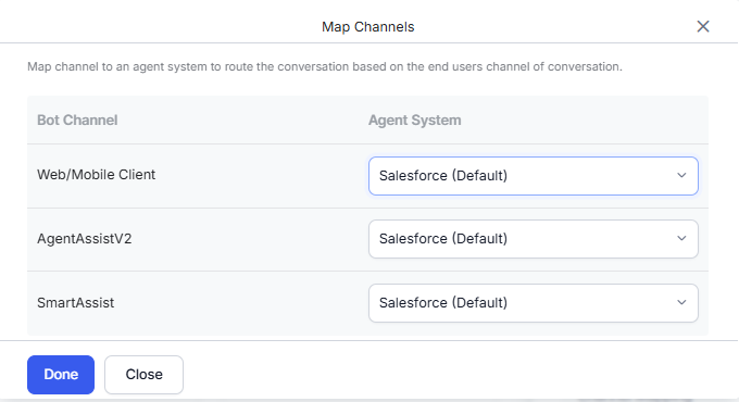 If you want to make Salesforce the default agent, enable the Default Agent System for all bot channels option.