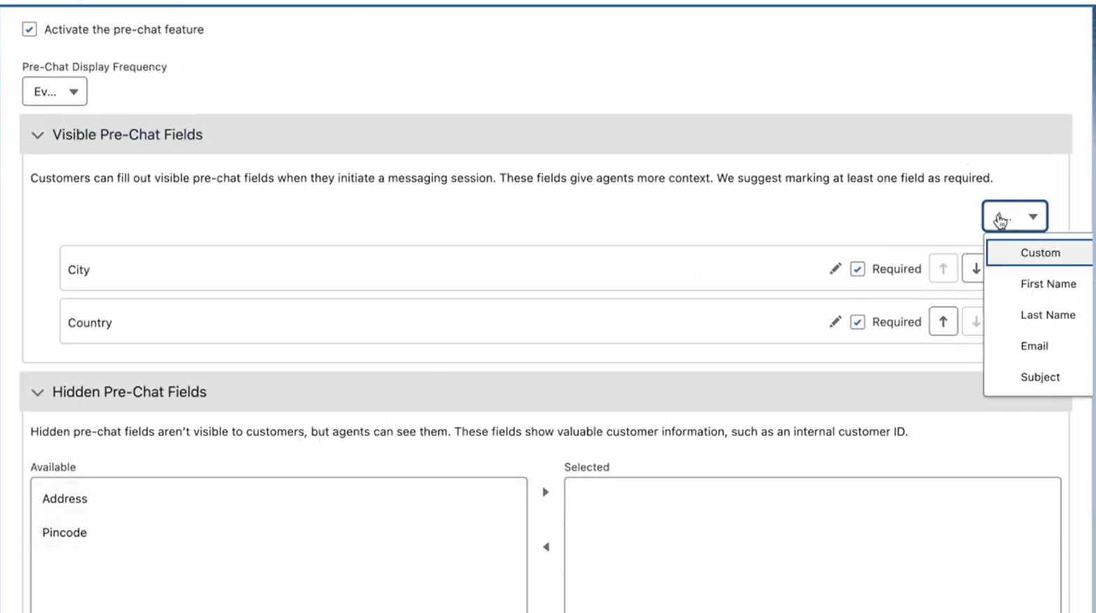 In the Visible Pre-Chat Fields section, click Add. Select the field type to add the created field, which is available in the Hidden Pre-Chat Fields section.
