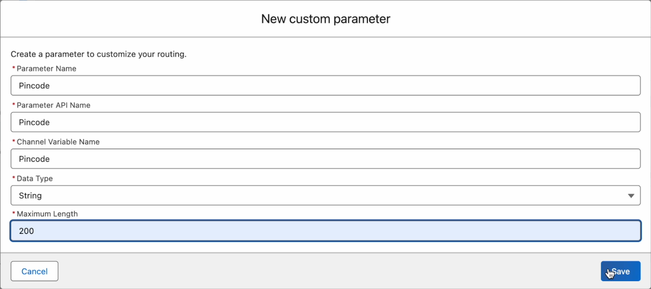Enter Parameter Name, Parameter API Name, Channel Variable Name, Data Type, and Maximum Length. Click Save.