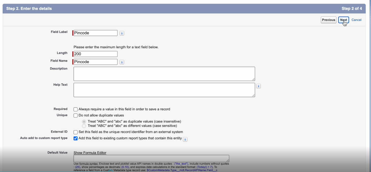 Enter the Field Label, Length, and Field Name values. Click Next.