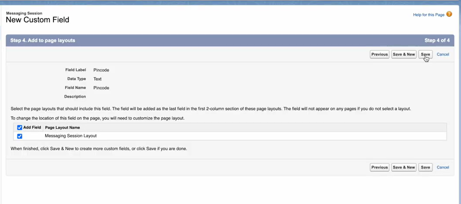 - Navigate to Object Manager > Messaging Session > Fields & Relationships.