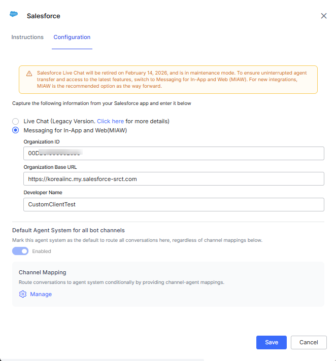 On the Configurations tab, select Messaging for In-App and Web(MIAW) and enter the following credentials for the Salesforce Agent: