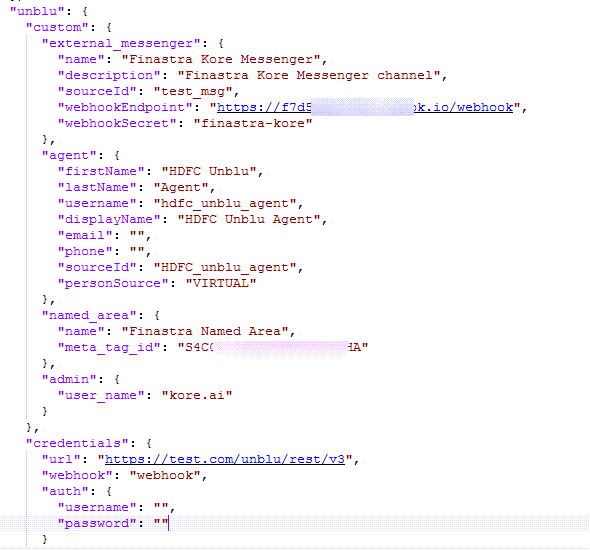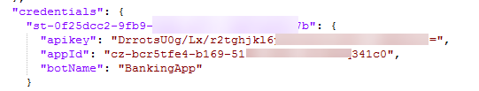 Under the credentials section, paste the Kore app details: API Key (client secret), App ID (client id), and Bot Name. Refer to the below image.