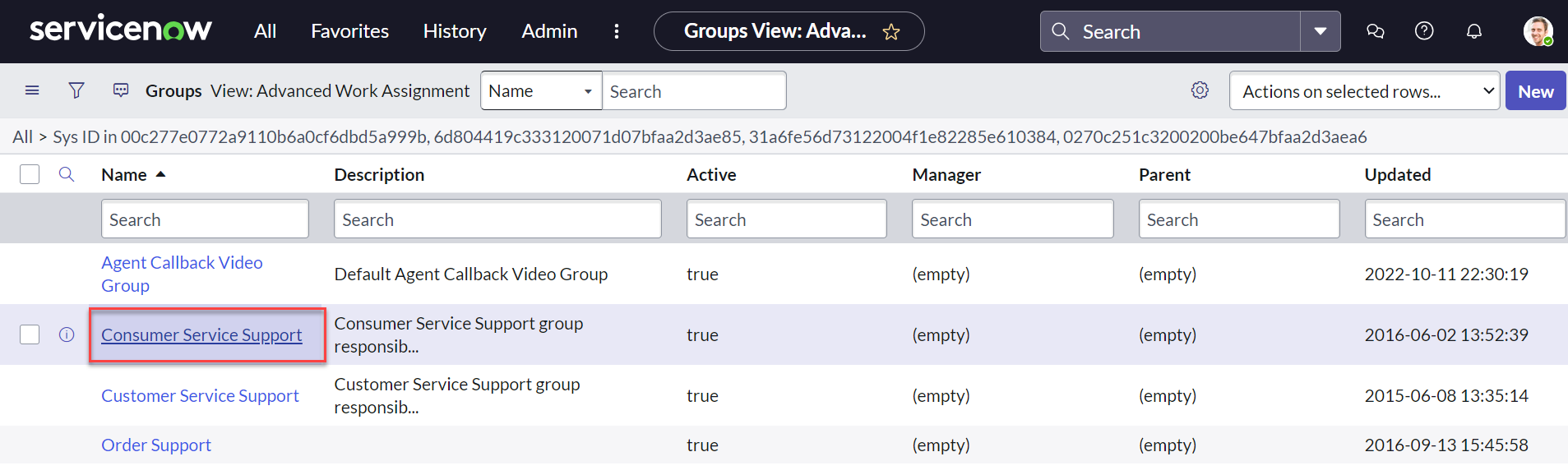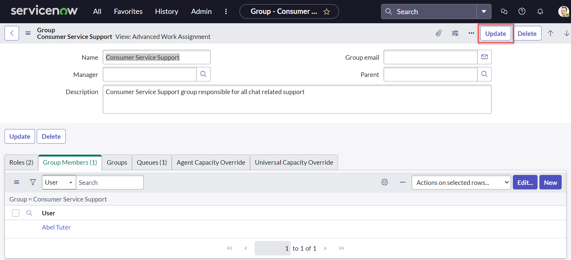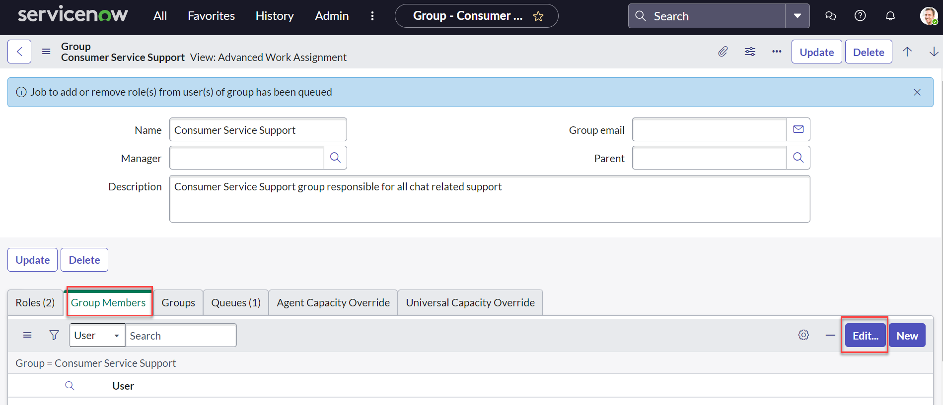 Select the Consumer Service Support group and navigate to the group details screen.