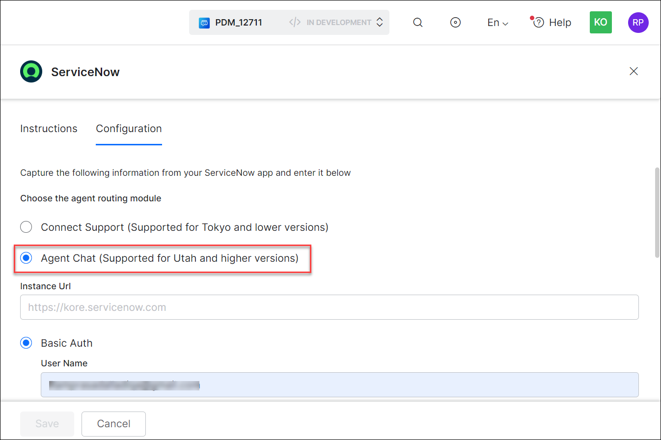 Navigate to App Settings > Integrations > Agent Transfer and click the ServiceNow.