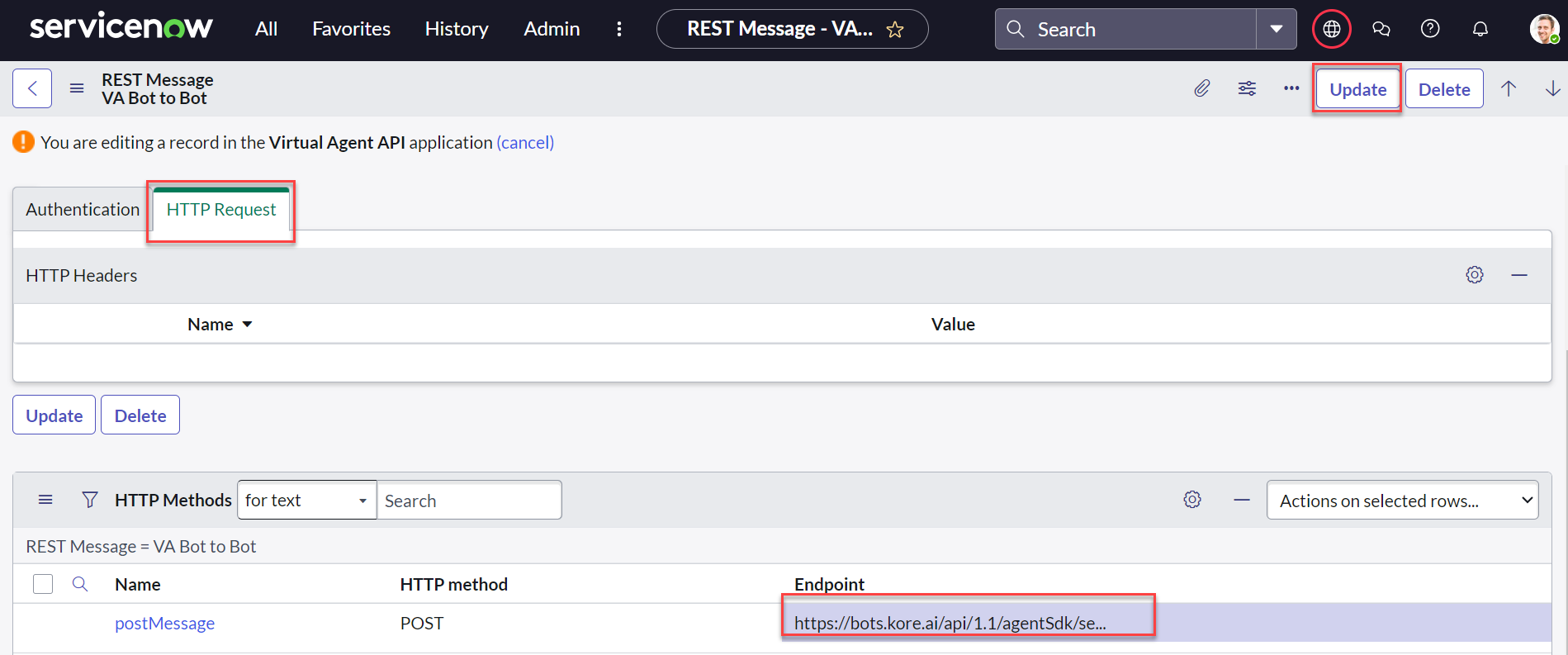 Scroll down and select the HTTP methods, update the same Webhook URL for the postMessage and click Update.