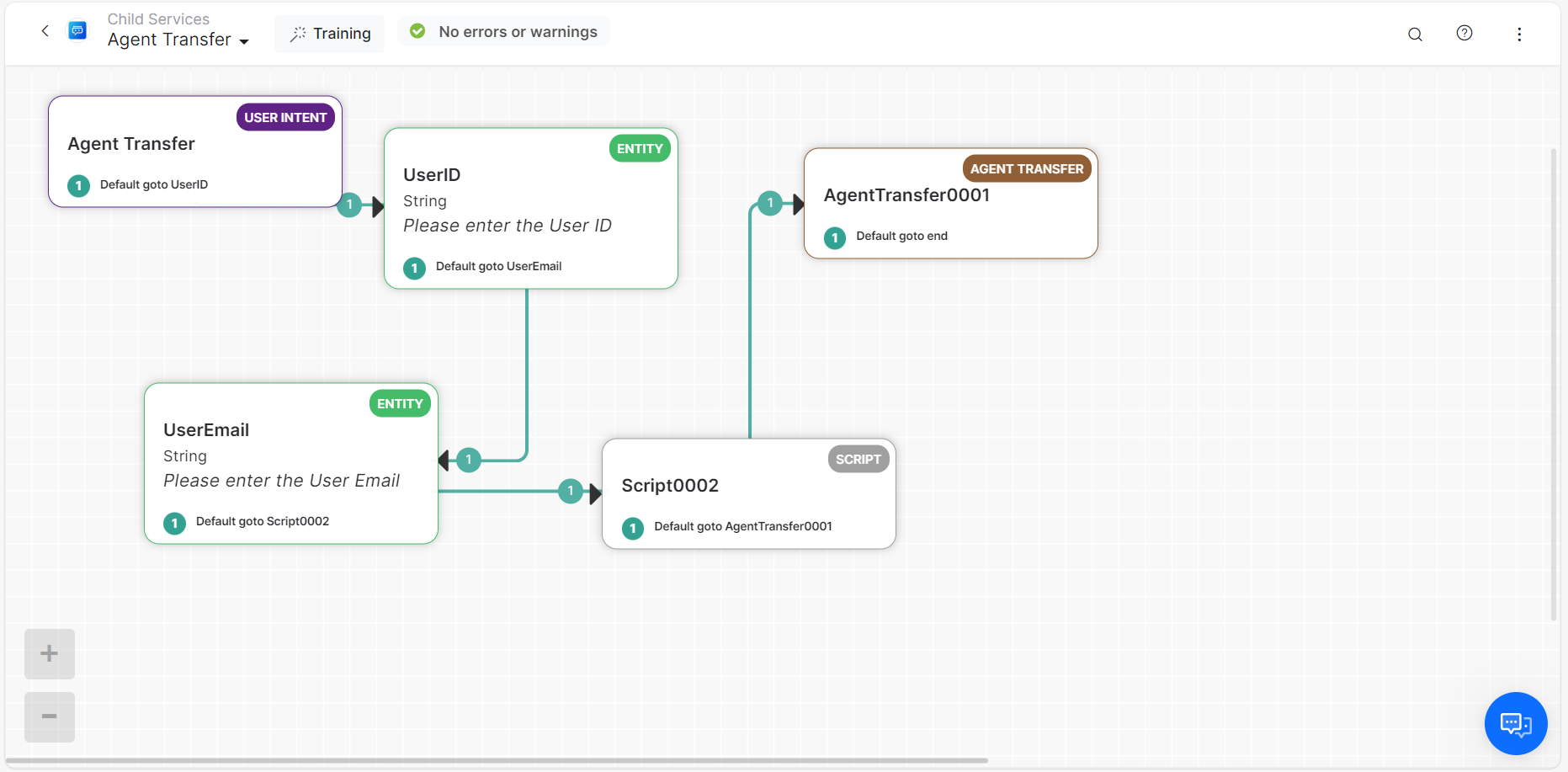 Before the agent transfer node is executed, you must set the meta info (userId, emailId, and the static token generated in the previous step) in the context in a specific format.