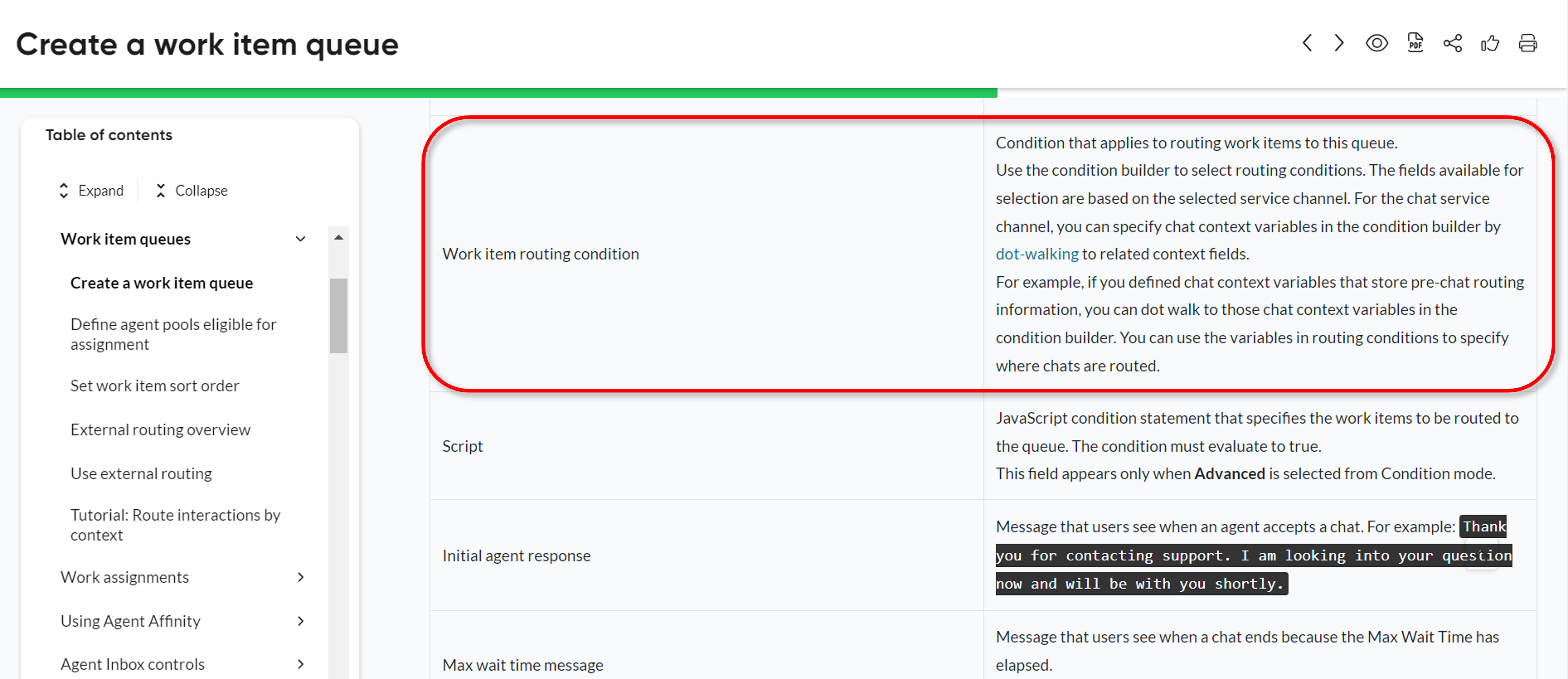 For more information on the Work item routing condition and queue, see the following links and sample screenshots from the ServiceNow product documentation.