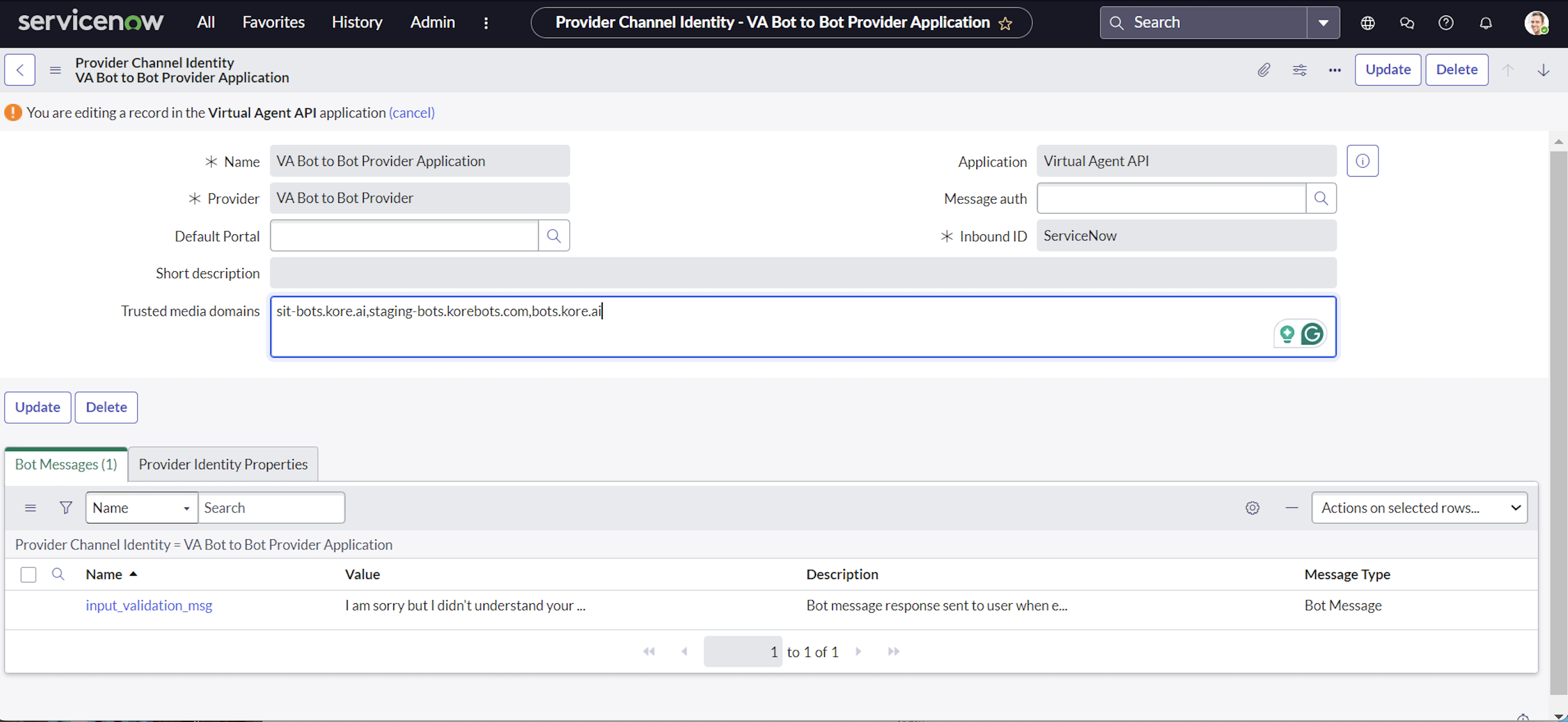 Edit the VABot to Bot details, Copy the Webhook URL from the Configuration tab of ServiceNow Agent page, and paste it into the EndPoint field on the VABot to Bot edit details.