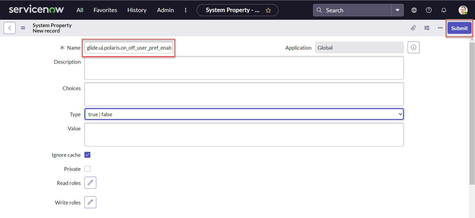 Enter the glide.ui.polaris.on_off_user_pref_enabled property, select the type as true|false, and click Submit.