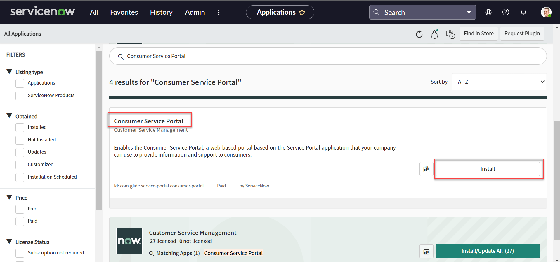 Search for the Consumer Service Portal plugin and install it.