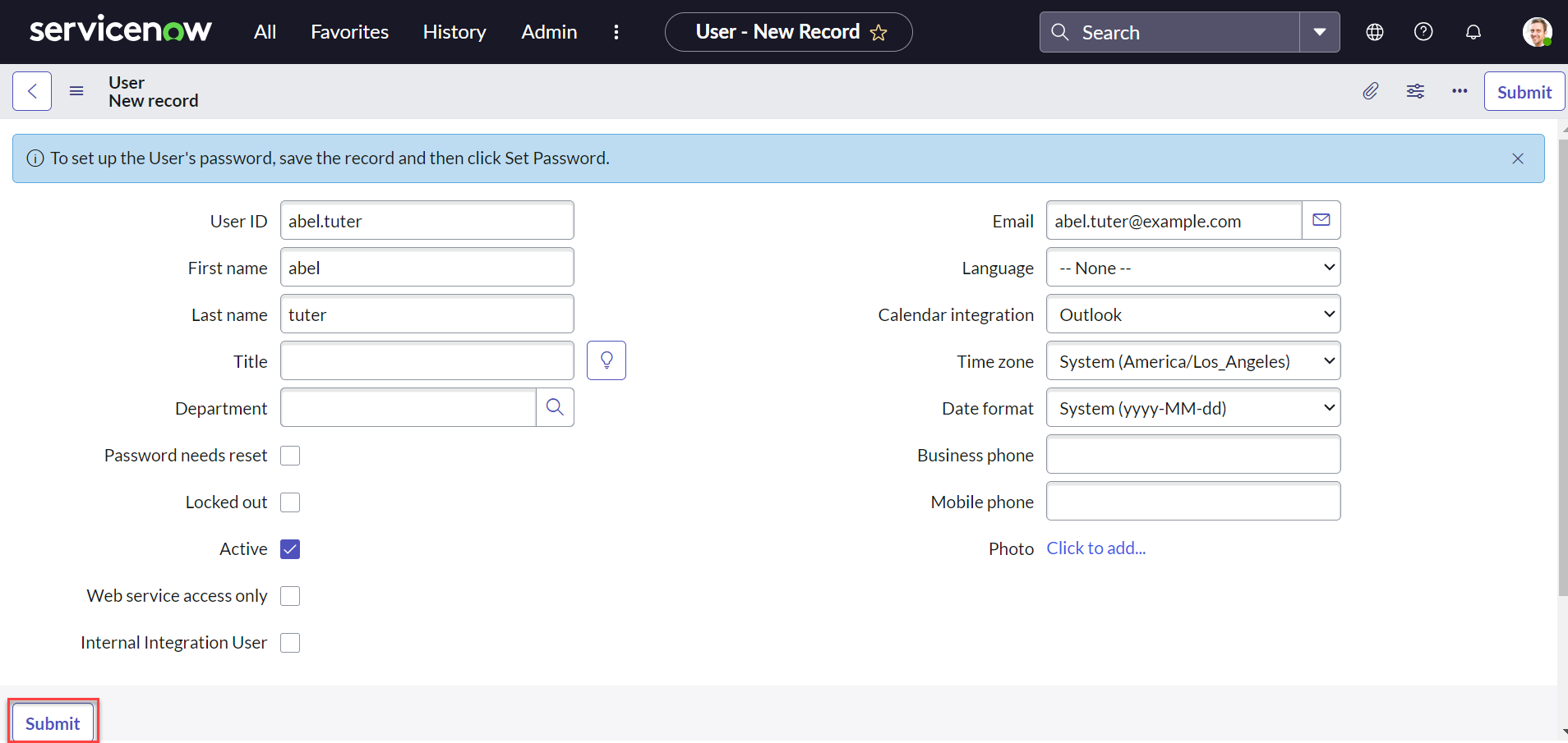 Fill in the details to create a user and click Submit.