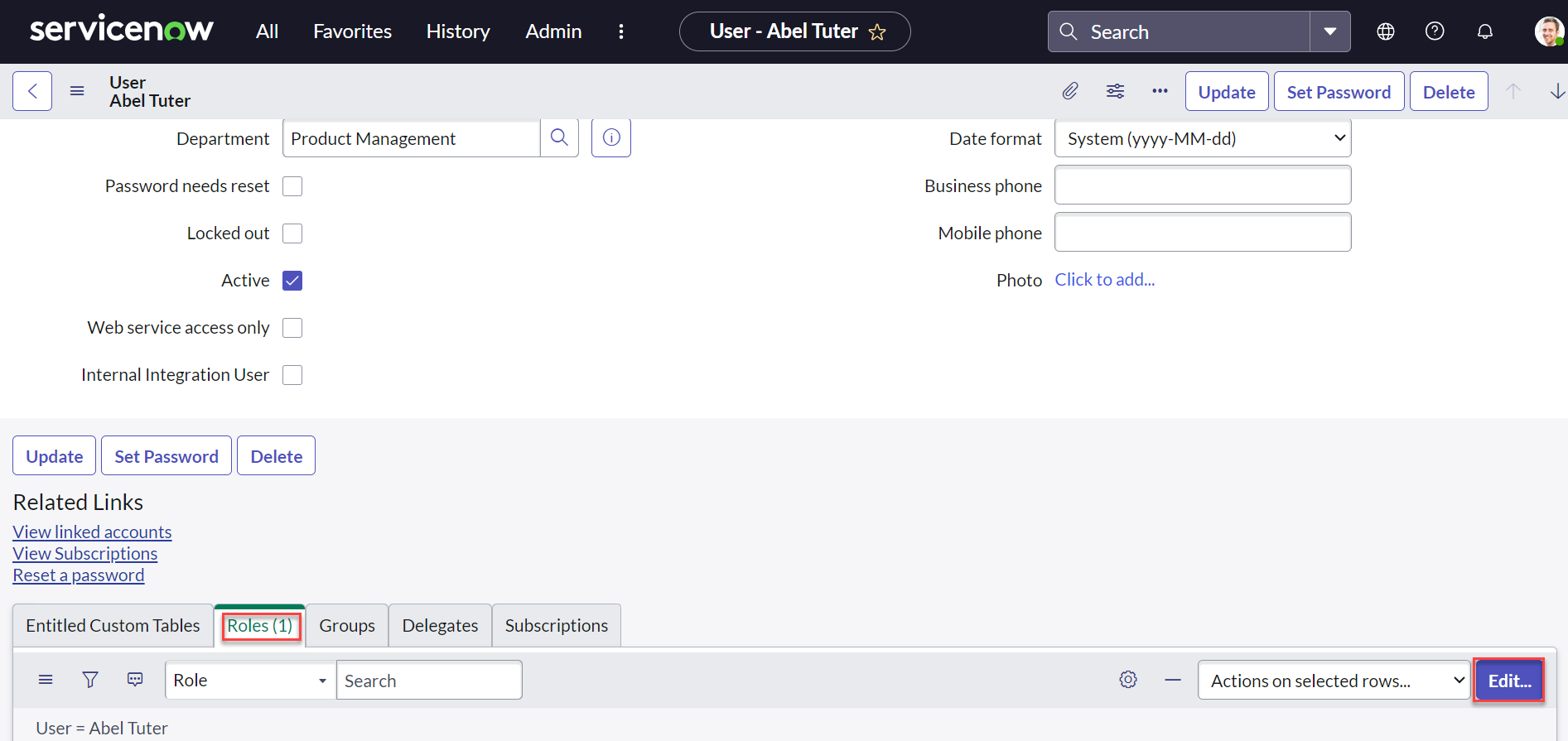 Select the Roles tab and click the Edit button to navigate to the roles screen.