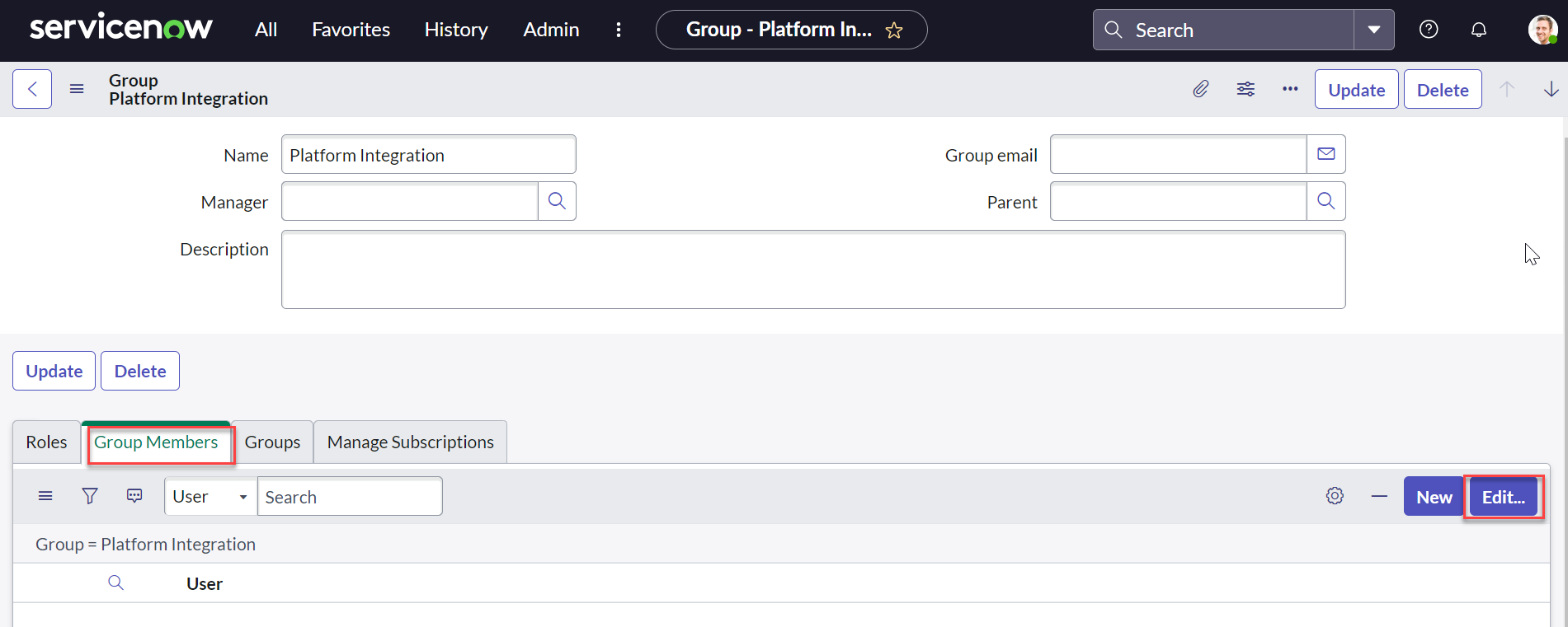 Edit the group created above. Scroll down to the Group Members tab and click Edit.