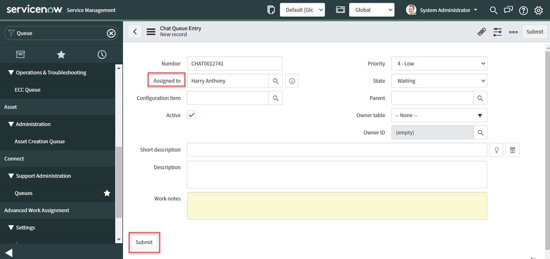 Click Submit to save the chat queue entry details.