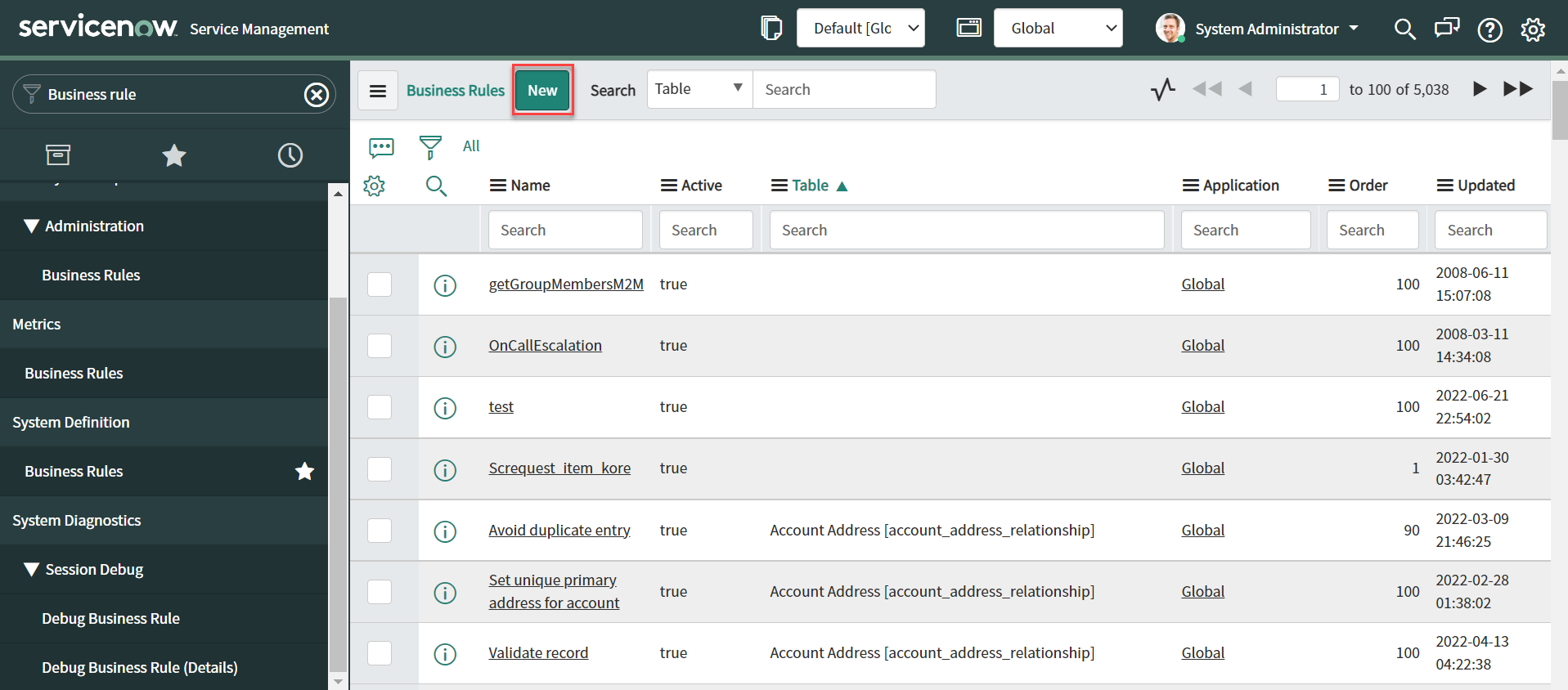 Click the New button to configure the Business Rule.