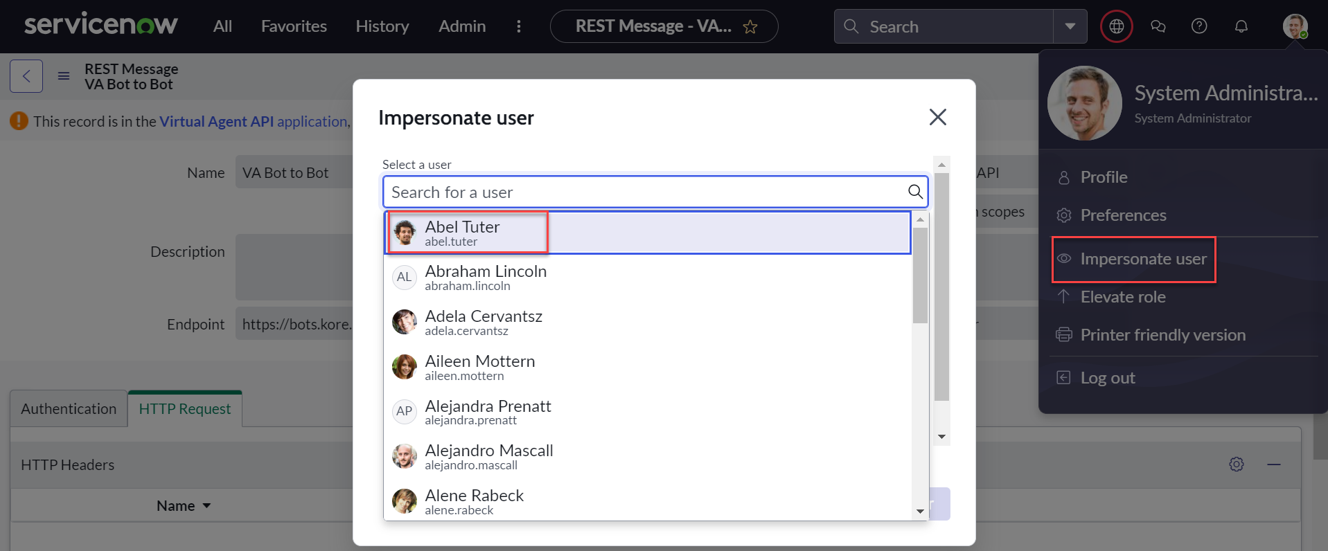 Log in to the ServiceNow Instance, select the Impersonate User from the Profile option as shown: